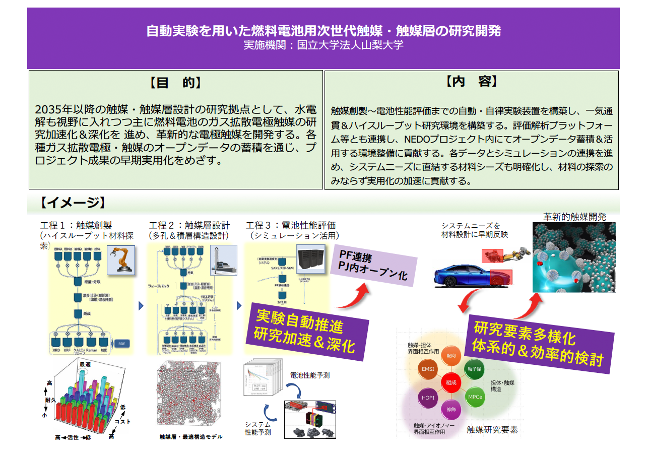 燃料電池・水素技術開発は物理的な実体を対象とした技術の開発であるため、研究開発の中で実施される実験の自動化はDXとして欠くことができない重要な要素であり、このための拠点として山梨大学を整備する採択がなさました。