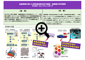 今回採択された7つの事業では、これまでの成果を活かしながら、自動実験等の新たな発想を取り入れることにより、NEDO戦略ロードマップ等で定められる高性能・高耐久・低コストを実現するための技術を開発します。