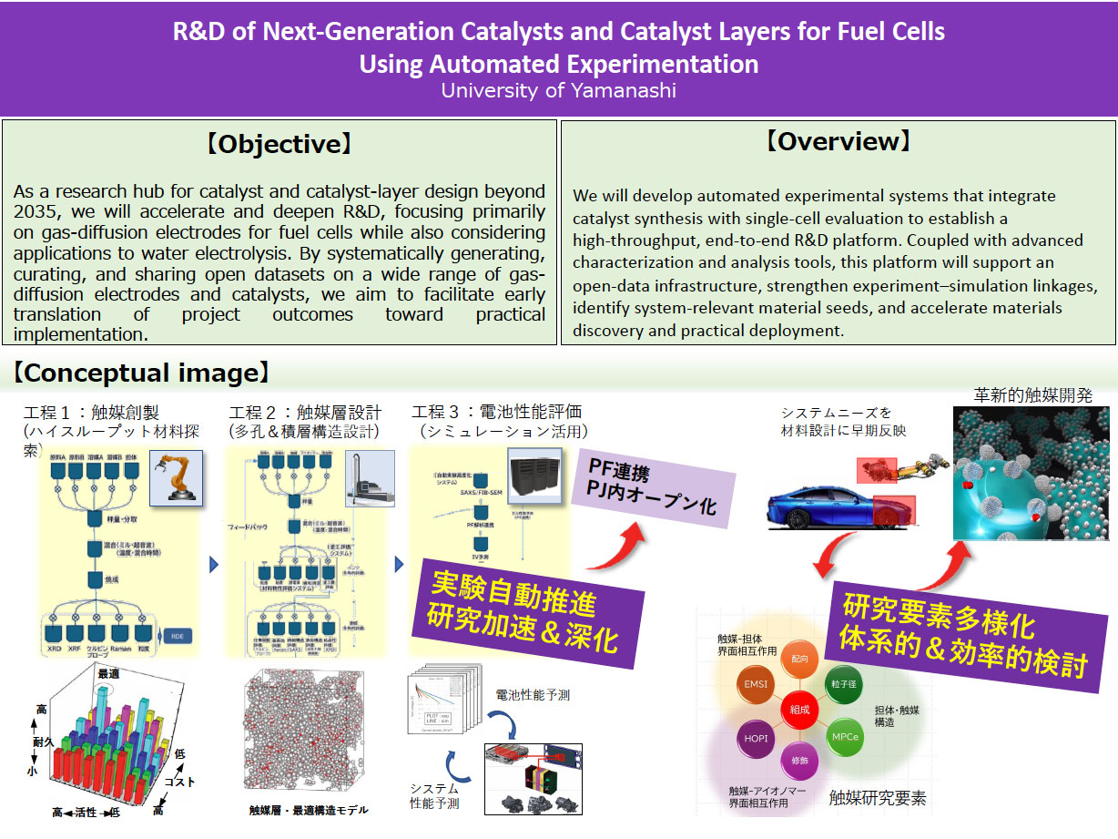 Technological capabilities in advanced fields form the foundation of national industrial competitiveness, and Digital Transformation (DX) in R&D is essential for sustaining this edge. As fuel cell and hydrogen technologies involve physical material systems, automating experimental processes is a vital element of DX. Our university has been selected as a core institution to lead this NEDO-commissioned effort. We are constructing an integrated, automated platform for everything from material synthesis to power generation evaluation. This platform will be accessible to other research groups, and the data obtained will be shared openly to establish a global hub for advanced materials development and meet 2035 performance targets.