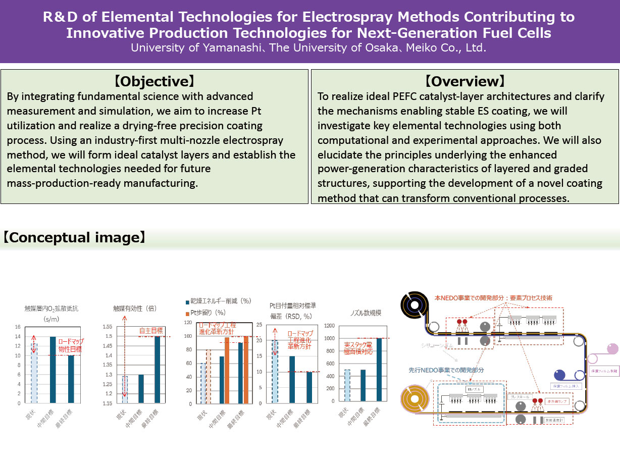 Since fiscal year 2008, the University of Yamanashi has been leading a series of NEDO-commissioned projects, including the Hi-Per FC Project (FY2008–FY2014), the SPer-FC Project (FY2015–FY2019), and the ECCEED Project (FY2020–FY2024). Throughout these programs, we have pursued research on catalysts, electrolyte materials, and catalyst layers to maximize fuel cell performance, specifically aiming for higher power output, enhanced durability, and greater efficiency. These efforts have resulted in numerous achievements recognized worldwide.