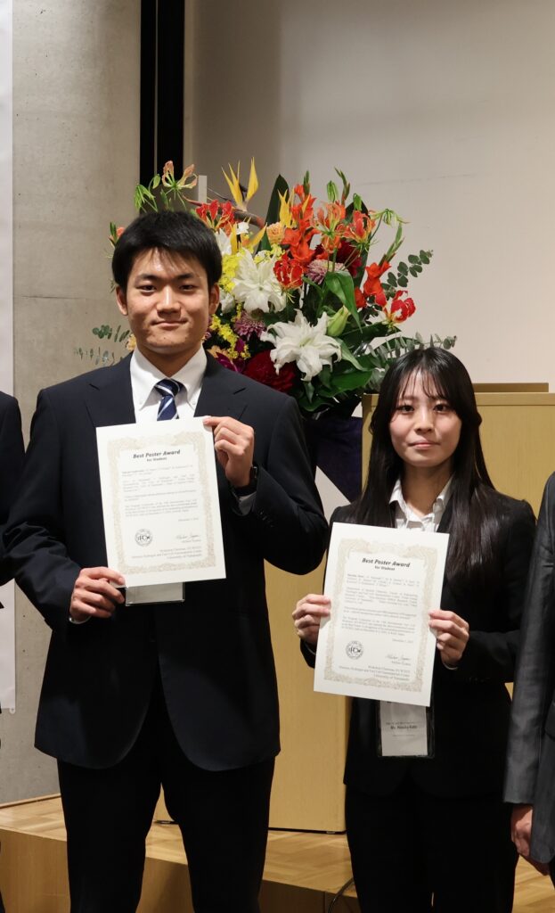 八代醍さんは「Best Poster Award for Studentを頂き、大変うれしく思います。本研究を進めるにあたり、内田誠先生をはじめ、日頃よりご指導・ご支援いただいている先生方、研究員の皆様、学生の皆様に心より感謝申し上げます。今回の受賞を励みに、低コスト化を踏まえたAEMWEの開発に一層尽力してまいります。」、加藤さんは「この度はPoster Awardを頂くことができ、大変光栄に思います。宮尾先生をはじめとする先生方、研究員の皆様、学生の皆様のご指導、ご支援のおかげです。これまで以上に研究に尽力していきます。」と述べています。
